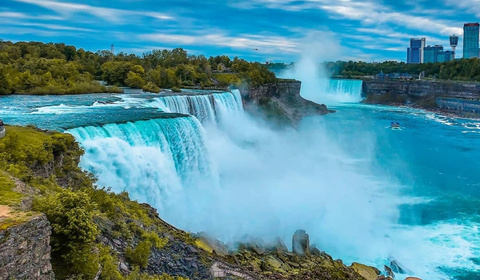 Depart early morning for the world-renowned Niagara Falls via Downtown Toronto. Upon arrival, visit the IMAX movie "Niagara: Miracles, Myths & Magic" to explore the captivating history of Niagara Falls. Then, proceed to the Skylon Tower for a panoramic view of the Horseshoe Falls, American Falls, and Bridal Veil Falls. After lunch, enjoy a ride on the famous Hornblower cruise (seasonal) for a close-up view of the magnificent Falls. Visit the Niagara wine region for a tasting of our world-famous ice wine before returning to Toronto.